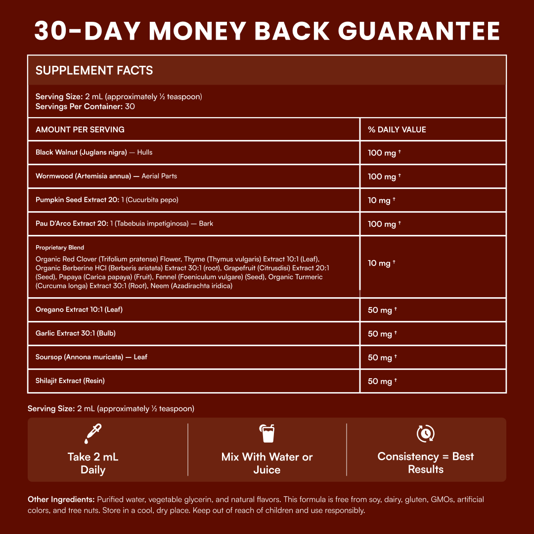 Our herbal formula targets hidden parasites and supports your body’s natural detox pathways.